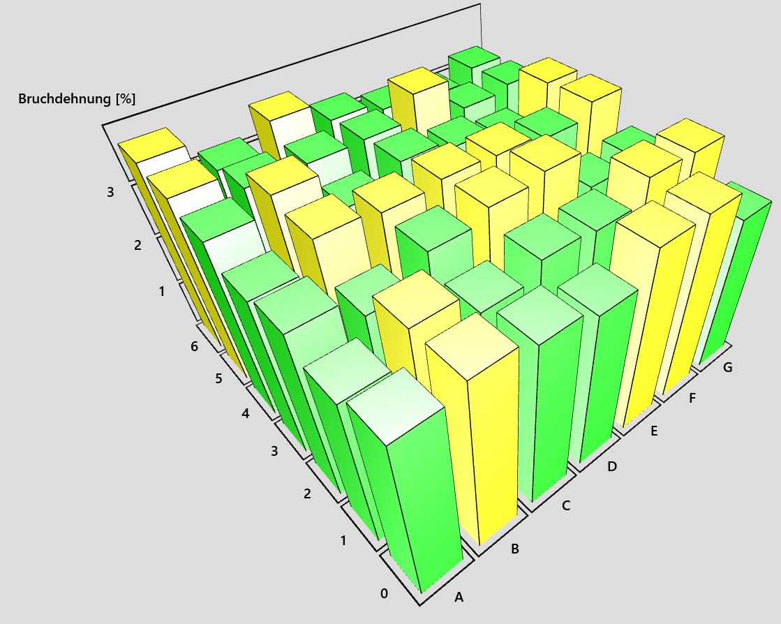 The results of the tensile tests allow these properties to be analyzed and assigned to the individual segments of the build envelope. For visualization purposes, a heat map can be created that shows in color whether predefined limit values have been reached or not. Based on this, the machine can be adjusted. Important parameters for the initial verification as well as the ongoing control of the industrial machine capability are the mechanical-technological properties according to DIN EN ISO 527-1:2019-12: